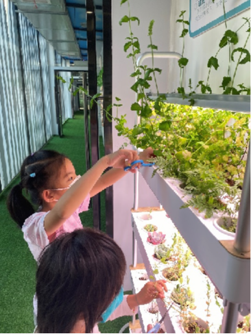生态园里精准的控温控湿系统让植物和菌类在适宜的环境中生长。即使遇到恶劣天气,我们可以通过全光谱植物生长灯,给植物们建造了一间“阳光房”。学生们在这里水培了植物,收获快乐。